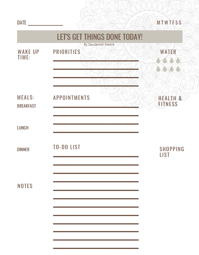 The page is designed with space for you to list your priorities, your water intake, your intended meals, appointments, a shopping list, and a to-do list! It's a great summary of everything you need to orient yourself for your upcoming adventures.