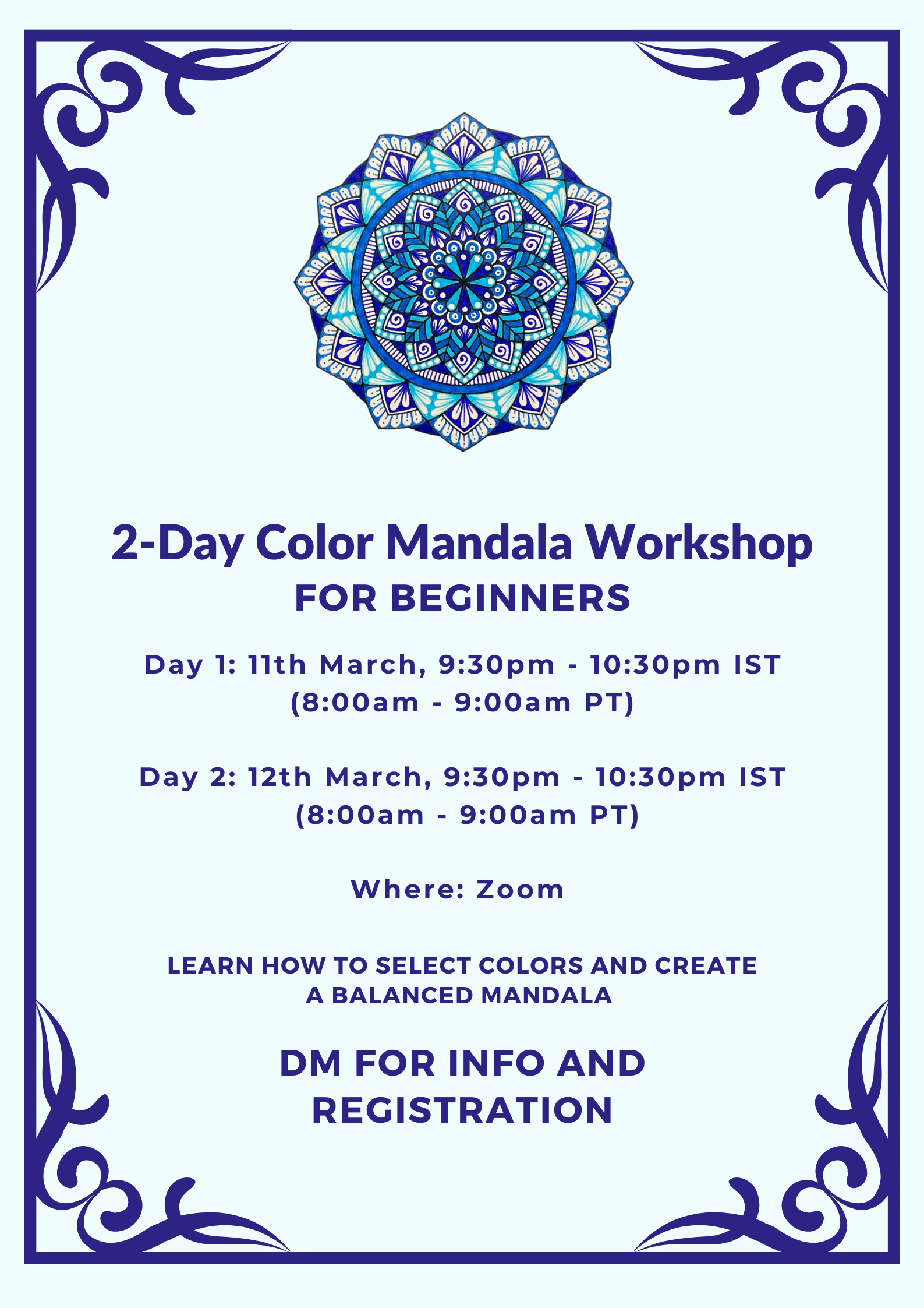 In just two hours you'll go from a blank canvas to a colorful masterpiece. This workshop is beginner friendly and can be very helpful for anyone looking to enter the world of colorful mandalas.