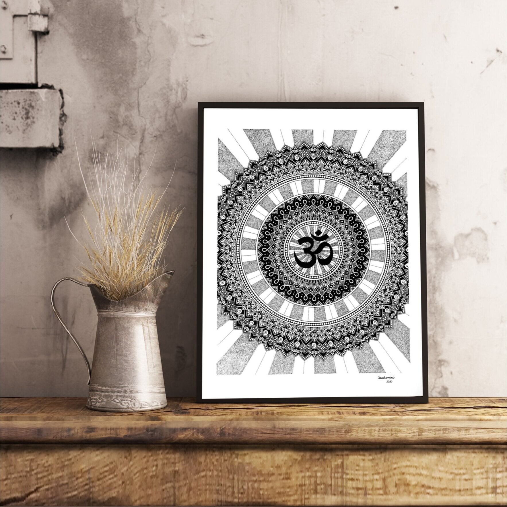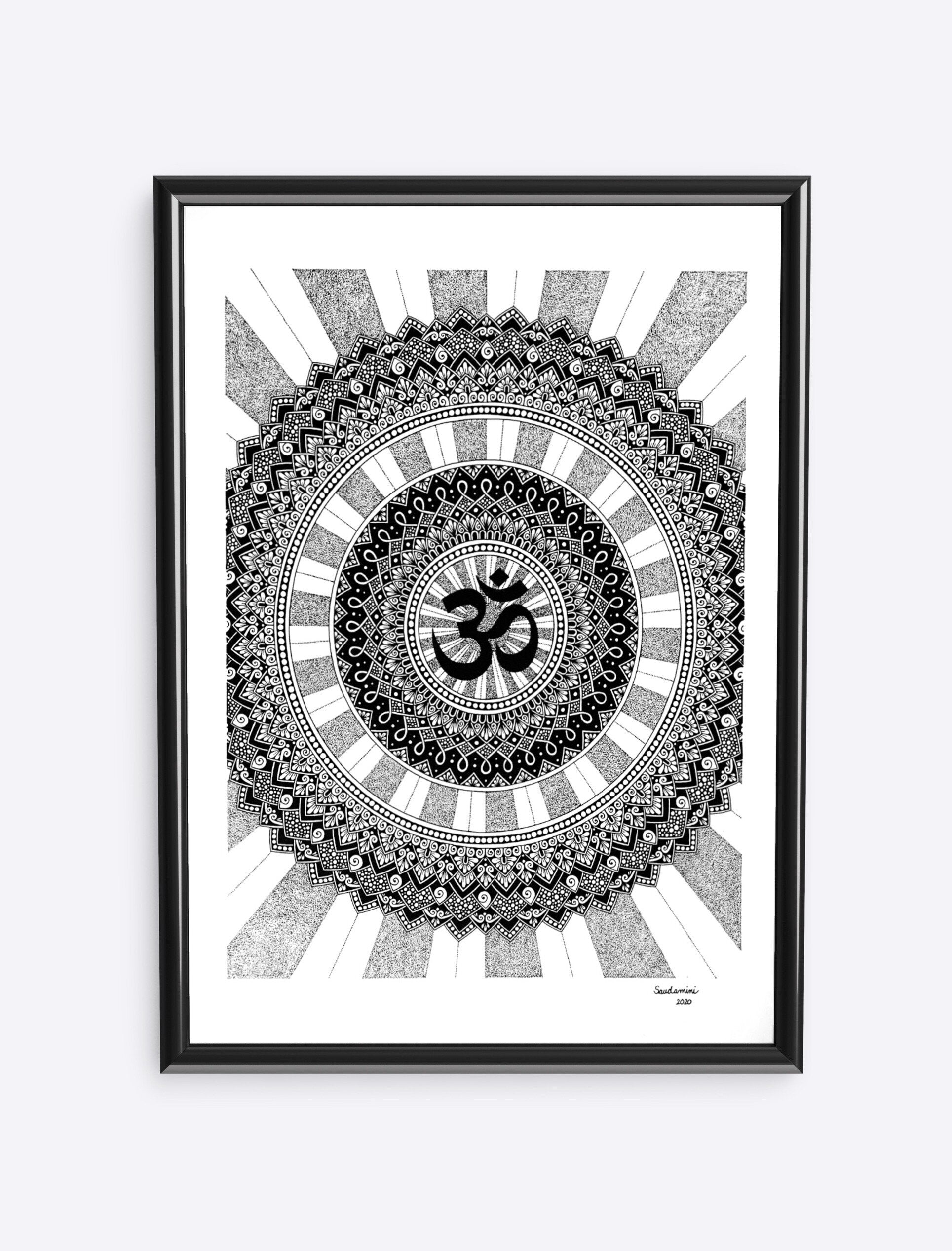 A mandala encircles the OM symbol with rays of light bursting outward.