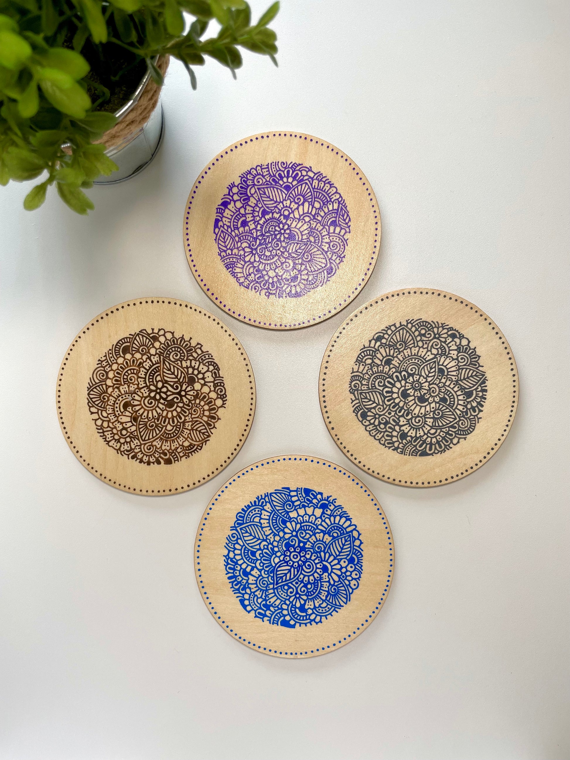 A set of four multi-color coasters, each one boasts its own original zentangle design rendered in shades of captivating colors, creating a one-of-a-kind piece that is sure to impress your guests. These also make for a perfect gift!